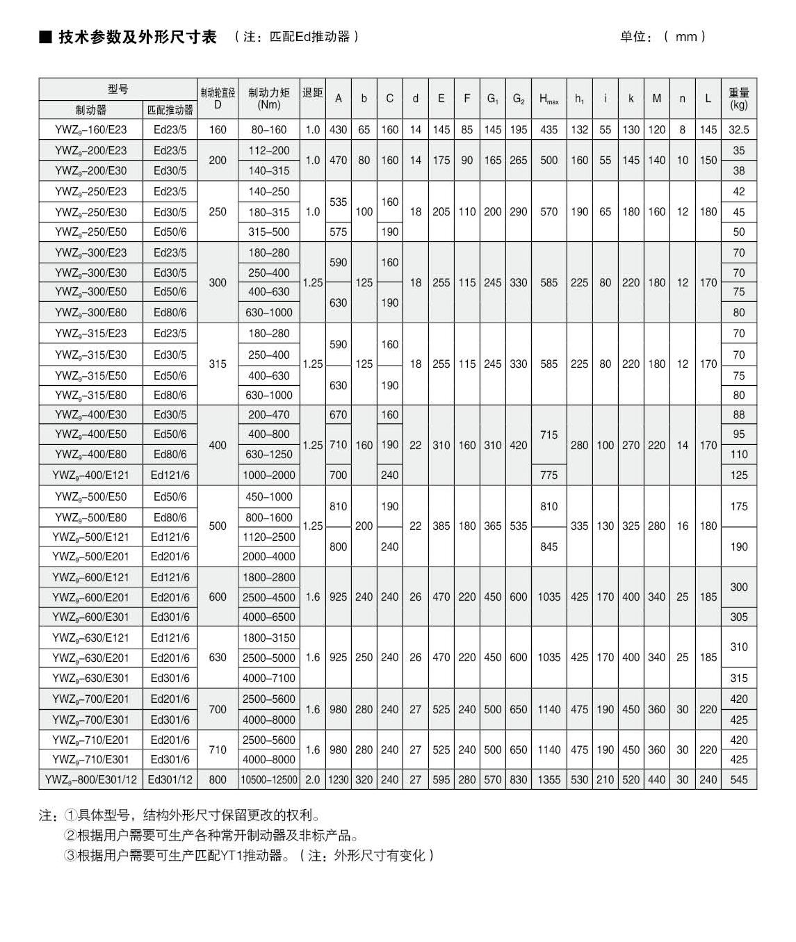 應用:YWZ5  YWZ9系列電力液壓鼓式制動器,廣泛應用于有防爆要求的各種起重運輸、皮帶運輸、港口裝卸、冶金及建筑機械中各種機構(gòu)的減速和停車(維持)制動。符合標準:YWZ5系列電力液壓鼓式制動器的連接尺寸和制動力矩參數(shù)符合GB6333-86標準,技術(shù)要求符合JB / T6406-2006標準,配套符合DIN15430標準的Ed系列推動器。主要特點:▲ 聯(lián)鎖式退距均等裝置和瓦塊自動隨位裝置,可始終保持兩側(cè)瓦塊退距均等且無需調(diào)整,完全避免因退距不均使一側(cè)制動襯墊浮貼制動輪的現(xiàn)象;▲ 主要擺動鉸點均設有自潤滑軸承,傳動效率高,壽命長,使用中無需潤滑;▲ 制動彈簧在方管內(nèi)布置并設有標尺,用戶可十分方便地讀出制動力矩值,免去測量和計算的麻煩;▲ 制動襯墊為卡裝式整體成型結(jié)構(gòu),更換十分方便、快捷,備有半金屬(無石棉)硬質(zhì)和半硬質(zhì),軟質(zhì)(無石棉)等不同材質(zhì)的制動襯墊供用戶選擇;▲ 配套Ed系列電力液壓推動器產(chǎn)品,動作靈敏、使用壽命長;▲ 常閉式設計,(斷電)彈簧制動,(通電)推動器釋放。工作條件:◆ 海拔高度:<2000m;◆ 環(huán)境溫度:-20°C?+ 40°C;◆ 相對濕度:≤90%;◆ 工作制:間歇性(S3-60%)和連續(xù)(S1);◆ 電源電壓:三相交流,AC380 50Hz (其他電源等級可按需要定制);◆ 有特殊要求時在訂貨時協(xié)商確定?;緟?shù):● 產(chǎn)品型號:YWZ5-160、YWZ5-200、YWZ5-250、YWZ5-315、YWZ5-400、YWZ5-500、YWZ5-630、YWZ5-710、YWZ5-800● 適用輪徑:160~800mm● 制動力矩:80~12500Nm● 產(chǎn)品型號:YWZ9-160、YWZ9-200、YWZ9-250、YWZ9-300、YWZ9-315、YWZ9-400、YWZ9-500、YWZ9-600、YWZ9-630、YWZ9-700、YWZ9-710、YWZ9-800● 適用輪徑:160~800mm● 制動力矩:80~12500Nm